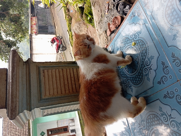 - "An orange and white domestic cat stands on a light blue tiled porch, decorated with white circular and floral patterns, facing right with its head slightly downturned" by FM-TnUEx2, licensed under CC BY 4.0