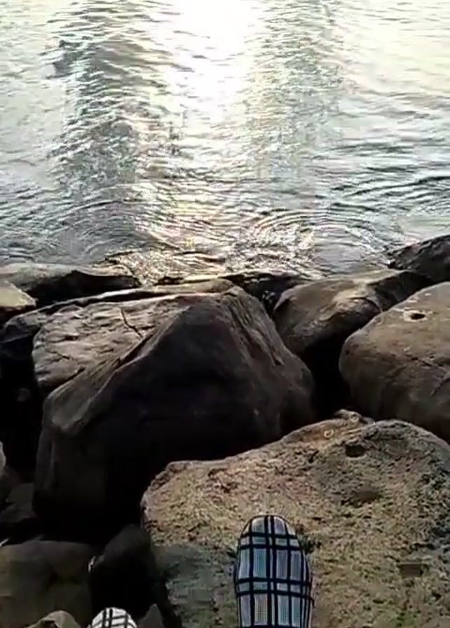 The video begins with a view of a person sitting on rocks by the sea. The person is wearing light-colored pants and shoes with a black and white checkered pattern. The camera focuses on the person's legs and feet. The view then pans up to show the sea, with sunlight reflecting on the water's surface. The sun is partially obscured by clouds. The scene has a calm and serene atmosphere.