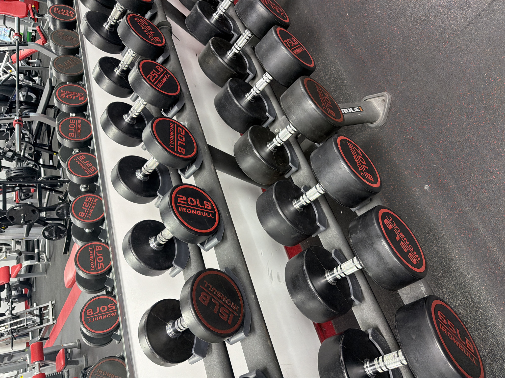 dumbbell rack in a gym. The dumbbells are black with red lettering indicating their weight, and they are labeled "Ironbull." Weights range from 15 to 75 pounds. The rack is gray. A sliver of the gym's weightlifting area is visible in the background, suggesting the gym is located in Las Vegas, United States of America.