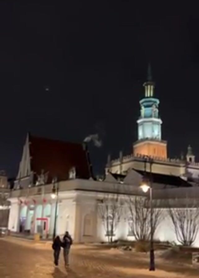 couple walking along a snow-covered, paved path in front of two buildings at night. The building on the left is white with a red roof and is decorated with Polish flags. Smoke is visible rising from a chimney on its roof. The building on the right is a tall, ornate structure with a spire. It is illuminated with white and yellow lights. A street lamp stands on the path in front of the couple. The sky is dark.