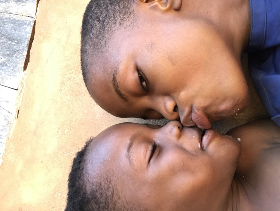 The image depicts two individuals, likely juveniles, with dark skin tones, in a close-up, eye-level orientation