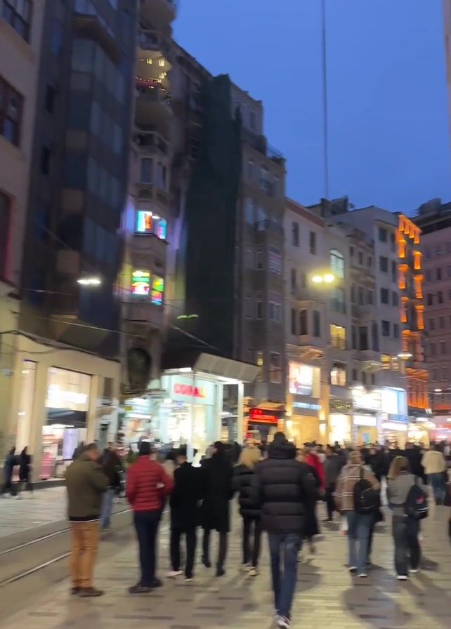The video depicts a bustling pedestrian street at dusk or early evening. Numerous people are walking in various directions. Buildings line both sides of the street, some with lighted windows and storefronts. The sky is a deep blue, suggesting the approach of night. The overall impression is one of urban activity and commerce.