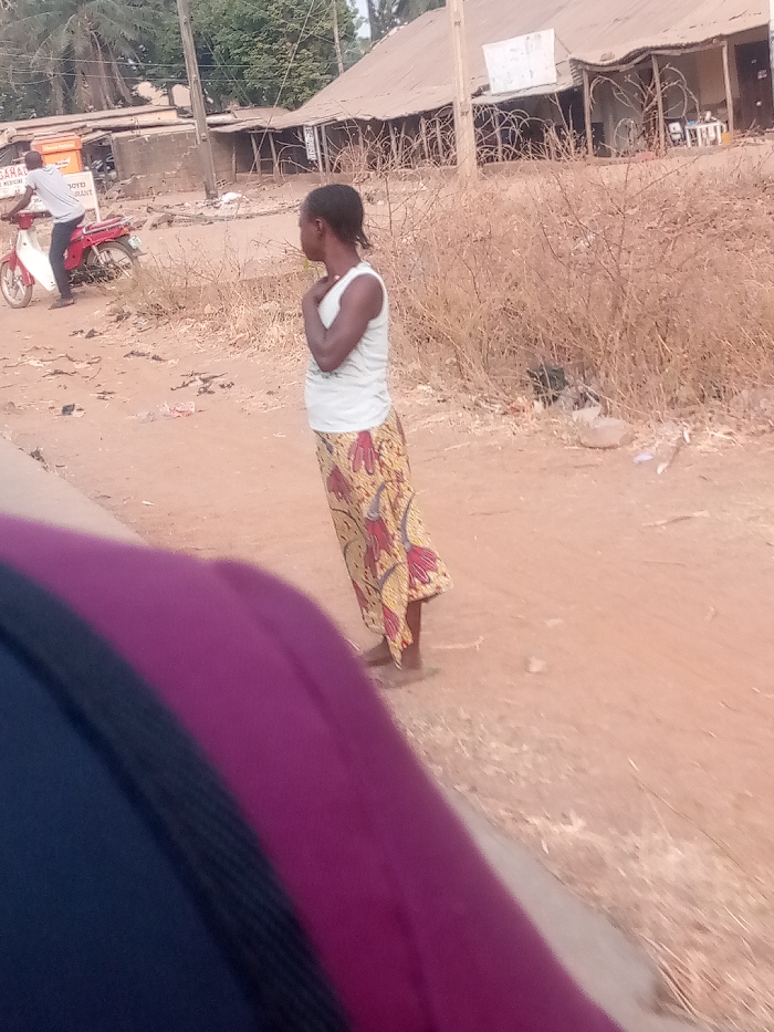 An outdoor scene in Maigizo, Nigeria, depicts a reddish-brown dirt road with sparse, dry vegetation and structures in the background