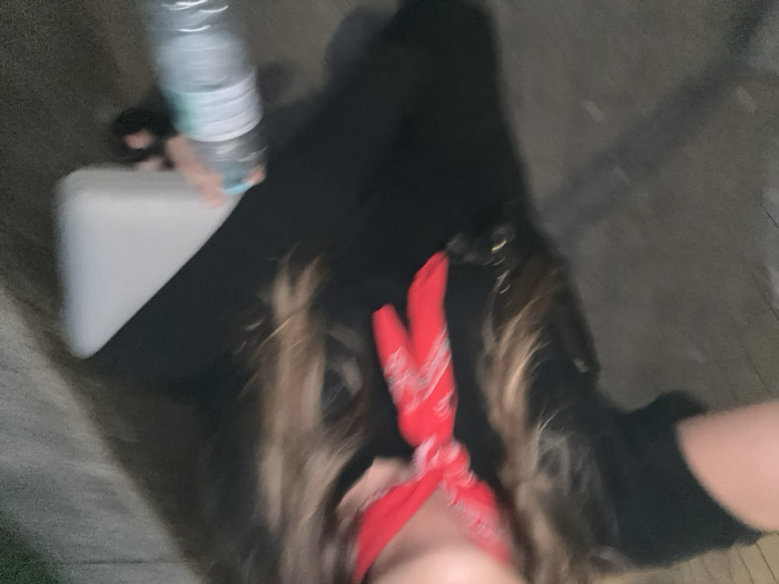 The image depicts a female individual from a high-angle, downward perspective, showing her upper torso and parts of her lower body. She has long, light brown hair and is wearing a black short-sleeved top and dark-colored pants. A red bandana with a white pattern is tied around her neck. Her right arm, extending downwards from the frame, holds a translucent plastic water bottle with a blue label. Her left hand holds a large, roughly triangular or wedge-shaped white object, possibly a sign or board. The ground beneath her is a dark, uneven surface, likely asphalt or concrete, with faint lighter markings, suggesting an outdoor setting. The lighting is subdued, indicating dusk or night. The specific location within Porto, Portugal, cannot be determined from the visual information provided in the image.