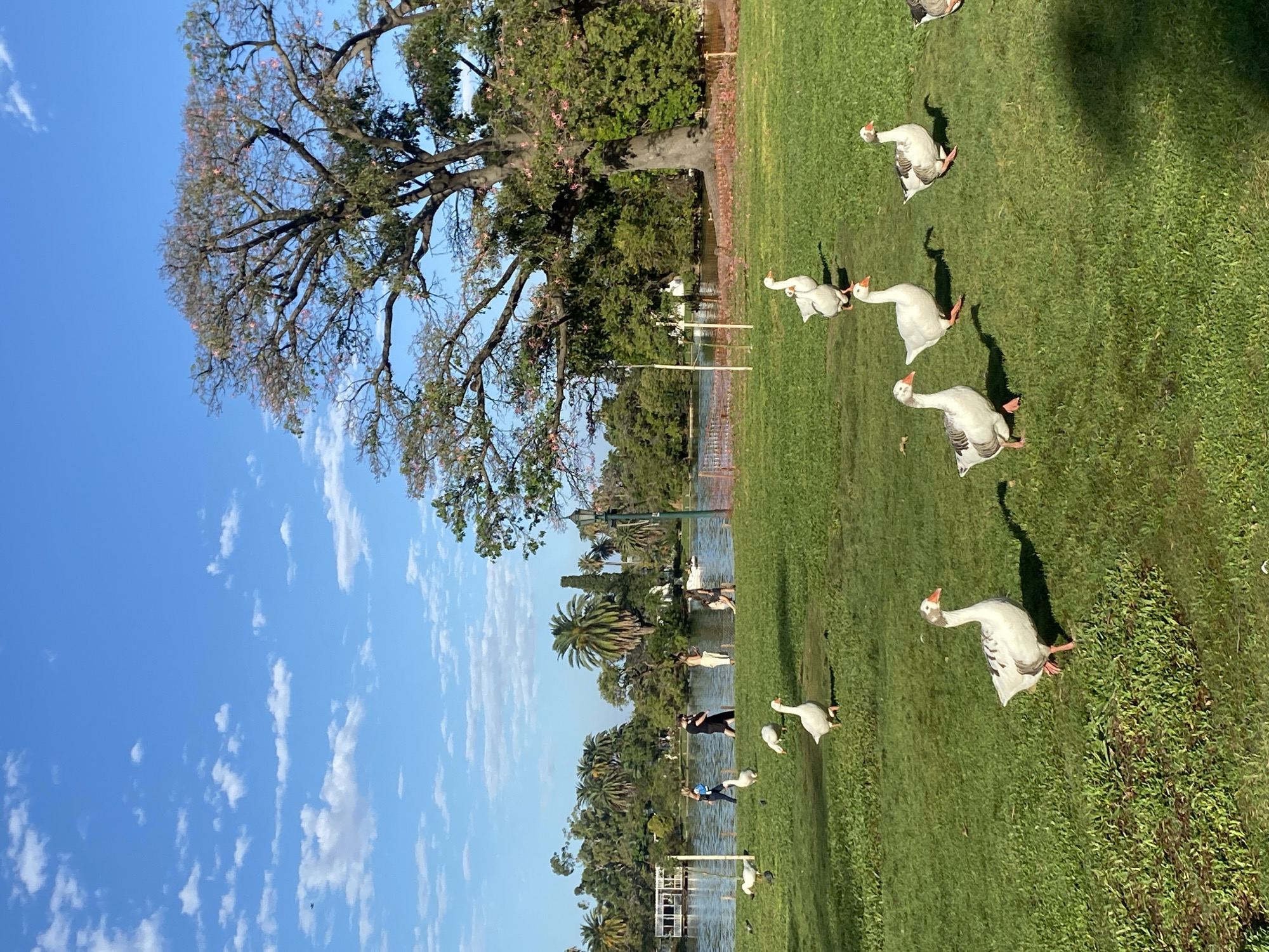 The scene depicts a park landscape in Buenos Aires, Argentina, on a sunny day with scattered clouds. The foreground is dominated by a vibrant green lawn where a flock of white geese with orange beaks is spread across the grass. The geese appear to be interacting with their environment, some with their heads up. In the background, there's a body of water, likely a lake or pond, with various palm trees and green foliage along the edges. A light structure or bridge extends partially into the water. People are visible near the water. A large tree with extensive branches stands in the left side of the image.