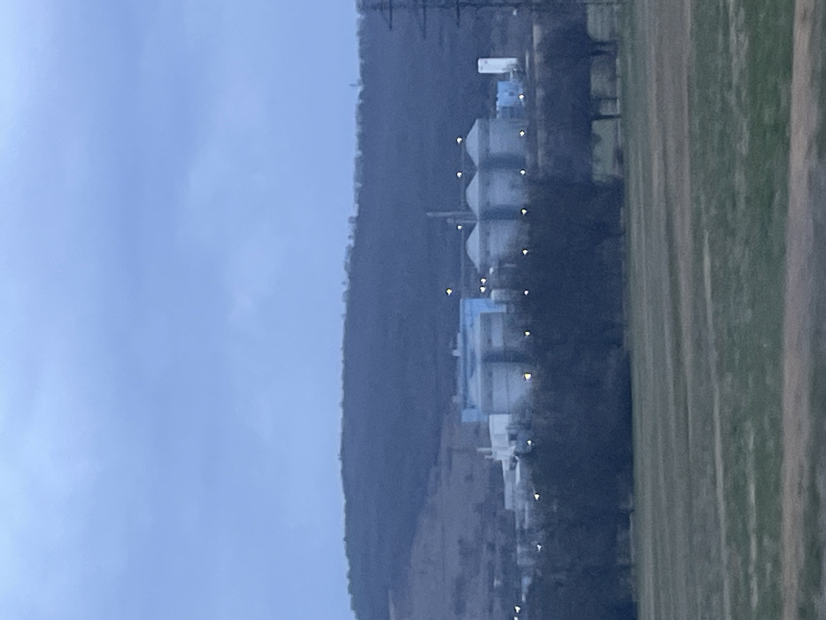 The image depicts an industrial facility, identified as located in the city of Verinsko, Bulgaria, under an overcast, light blue-grey sky. The scene is captured in muted light, suggesting dusk or dawn. In the foreground, an expansive field of mixed green and brown grass extends across the bottom third of the frame. A dark, horizontal line of bare deciduous trees partially obscures the lower sections of the industrial complex in the midground. The industrial facility itself comprises multiple large structures, predominantly in shades of grey and light blue. Key components include several large, cylindrical or conical silos, likely for storage, with three prominent ones clustered towards the right side of the main complex. Various other multi-story buildings, exhibiting industrial architecture, are visible. Numerous small, bright yellow or white artificial lights are illuminated across the facility, indicating ongoing operation. A slender, vertical stack or vent rises centrally from the plant. To the far right of the industrial complex, a tall, white, rectangular structure stands. In the far midground, on the right side of the frame, a dark, metallic lattice power line tower is partially visible. The background consists of a dark, undulating range of hills or low mountains, appearing densely wooded or vegetated, contrasting with the lighter sky above. No individuals or specific actions are discernible within the frame.