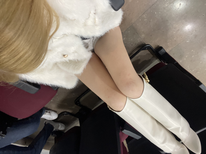 A person is seated, wearing a white faux fur coat. Their legs are crossed, clad in tan tights and white knee-high boots. They are seated in a theater with red upholstered seats. The floor is a marbled stone. Another person's legs can be seen in the lower left of the frame.