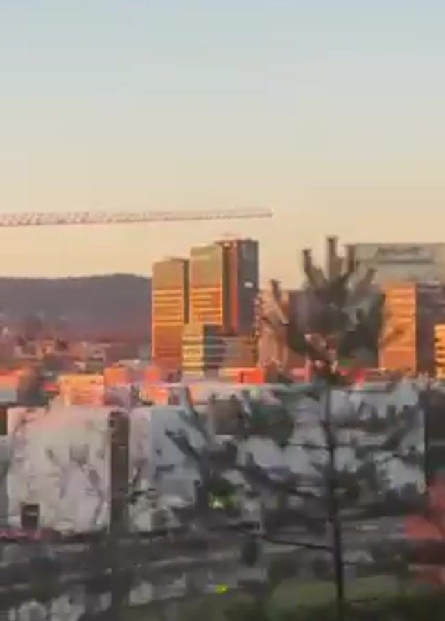 view of a city skyline at sunset, likely taken from a moving vehicle, possibly a train. Several modern buildings with golden reflections are visible, along with construction cranes. The foreground includes bare tree branches that intermittently obscure the view. The sky is light with shades of orange and pink from the setting sun. It is a blurred, fast-paced view of the urban landscape as seen through a window.