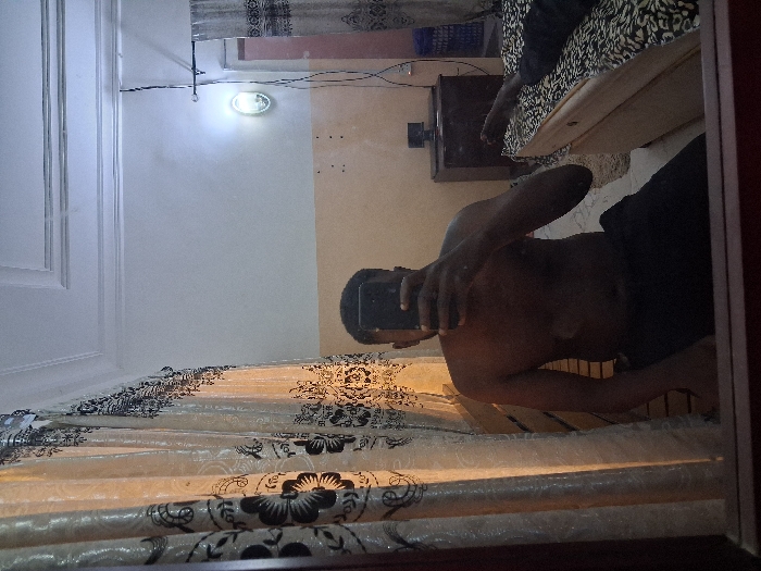The image displays an indoor scene, likely a bedroom, captured via a mirror selfie. A male individual with dark skin, shirtless and wearing dark trousers, is visible in the reflection, positioned kneeling or crouching while holding a dark smartphone that obscures his face. To the right of the frame, on a wooden-framed bed covered with a black-and-white patterned sheet, the lower legs of a second individual, also with dark skin and wearing dark trousers, are visible, indicating they are lying or reclining. The room's walls are two-toned: light cream on the upper section and peach-toned on the lower, separated by a horizontal line. Small marks or holes are visible on the lower wall. The ceiling is white with decorative coving. On the right wall, an oval-shaped, wall-mounted light fixture emits a bright glow. Dark electrical wires are visible running across the upper right wall. Light-colored curtains with dark floral or abstract patterns hang on both the left and right sides of the scene. A dark wooden chest of drawers or nightstand is visible in the background, topped with a small, dark rectangular object. A light-colored, possibly shaggy rug covers a portion of the floor. A blue plastic basket is partially visible in the far-right background. The specific location within the city of Howayi, Nigeria, cannot be determined from the visual information provided.