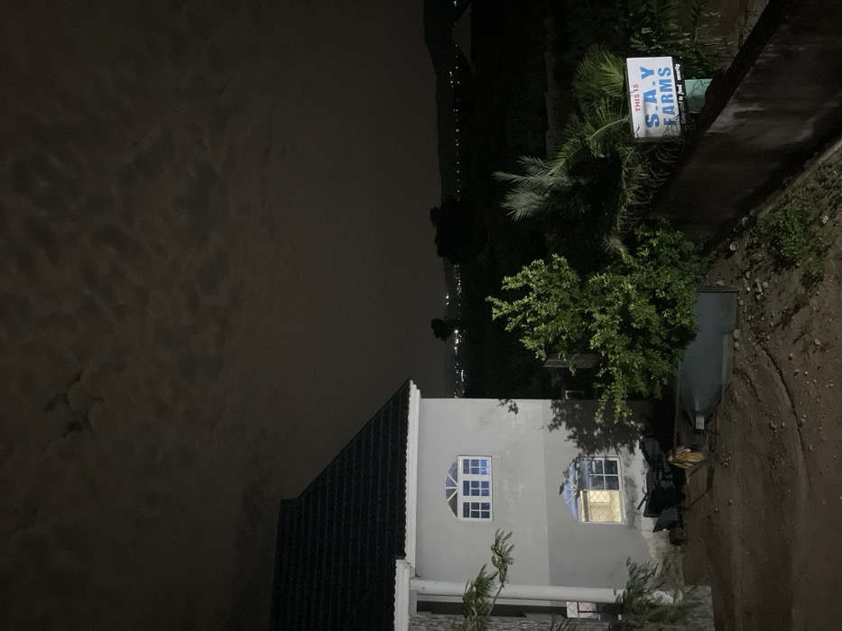 The image depicts a nighttime scene in Zango-ndaji, Nigeria, featuring a partial view of a building, an undeveloped ground area, and a distant landscape under a cloudy sky. On the left, a light-colored, multi-story building with a dark-tiled, pitched roof occupies the frame, showing two illuminated arched windows: an upper one with blue-white light and a lower one with warmer light revealing faint interior details. The ground in the foreground is dark, unpaved earth, showing tracks and uneven terrain. Near the base of the building, a dark, indistinct object, possibly refuse or discarded equipment, is visible. A vibrant green, leafy shrub stands centrally in the foreground, with a dark, rectangular trough or container positioned behind it. To the right, a dark, low wall or fence topped with barbed or razor wire extends across the midground. Attached to this wall is a white sign with blue text that reads "THIS IS S. A. Y FARMS" and smaller, less legible text below, likely "Committed to food security." A palm-like plant is visible behind the sign. The background consists of a dark, expansive rural or undeveloped landscape, characterized by sparse vegetation and distant, scattered artificial lights indicating a settlement, with faint hills or mountains outlining the horizon under a dark, heavily clouded sky. No individuals, animals, or specific actions are discernible.