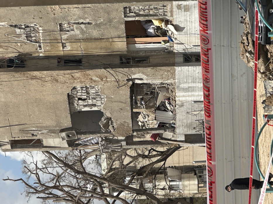 An exterior view captures a multi-story concrete building in Arad, Israel, exhibiting significant structural damage