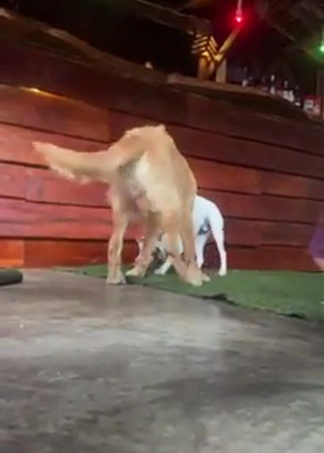 two dogs playing on an outdoor patio. One dog is golden and the other is white. They are on a section of artificial turf on a concrete floor. Behind them is a wooden structure with lights. A person wearing a purple garment is standing in the background. There is music playing in the video.