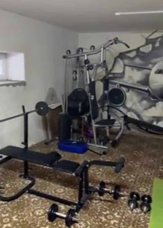home gym room. It has a weight bench, a multi-gym machine, dumbbells, and an airplane mural on the wall. There is also a flag with the colors red, yellow, and black. A piece of paper with handwritten text in Russian is pinned to a corkboard. The camera pans around the room, showing the equipment and details.