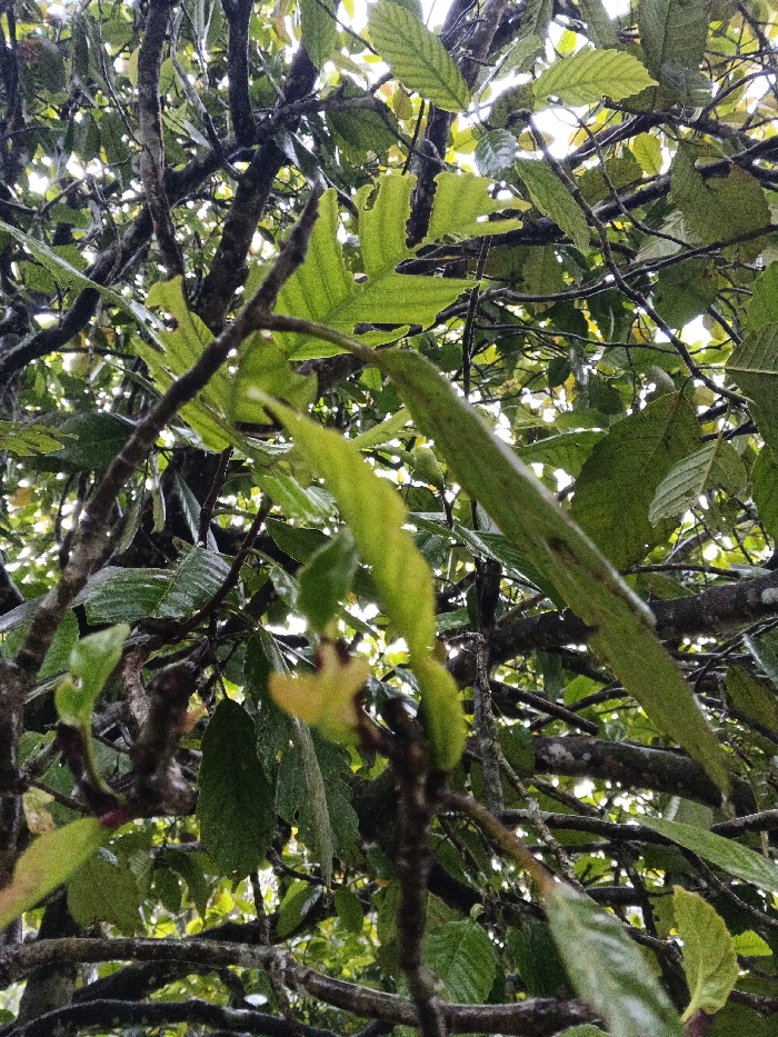 A view from beneath a tree canopy reveals a dense network of branches and foliage. The leaves are a mix of light and dark green, some with visible signs of wear or damage. The branches are mostly dark in color, textured with moss and lichen. Sunlight filters through the foliage, creating bright spots and shadows. A few slender, unripe seedpods hang from a branch, and a single yellow flower is visible nearby.