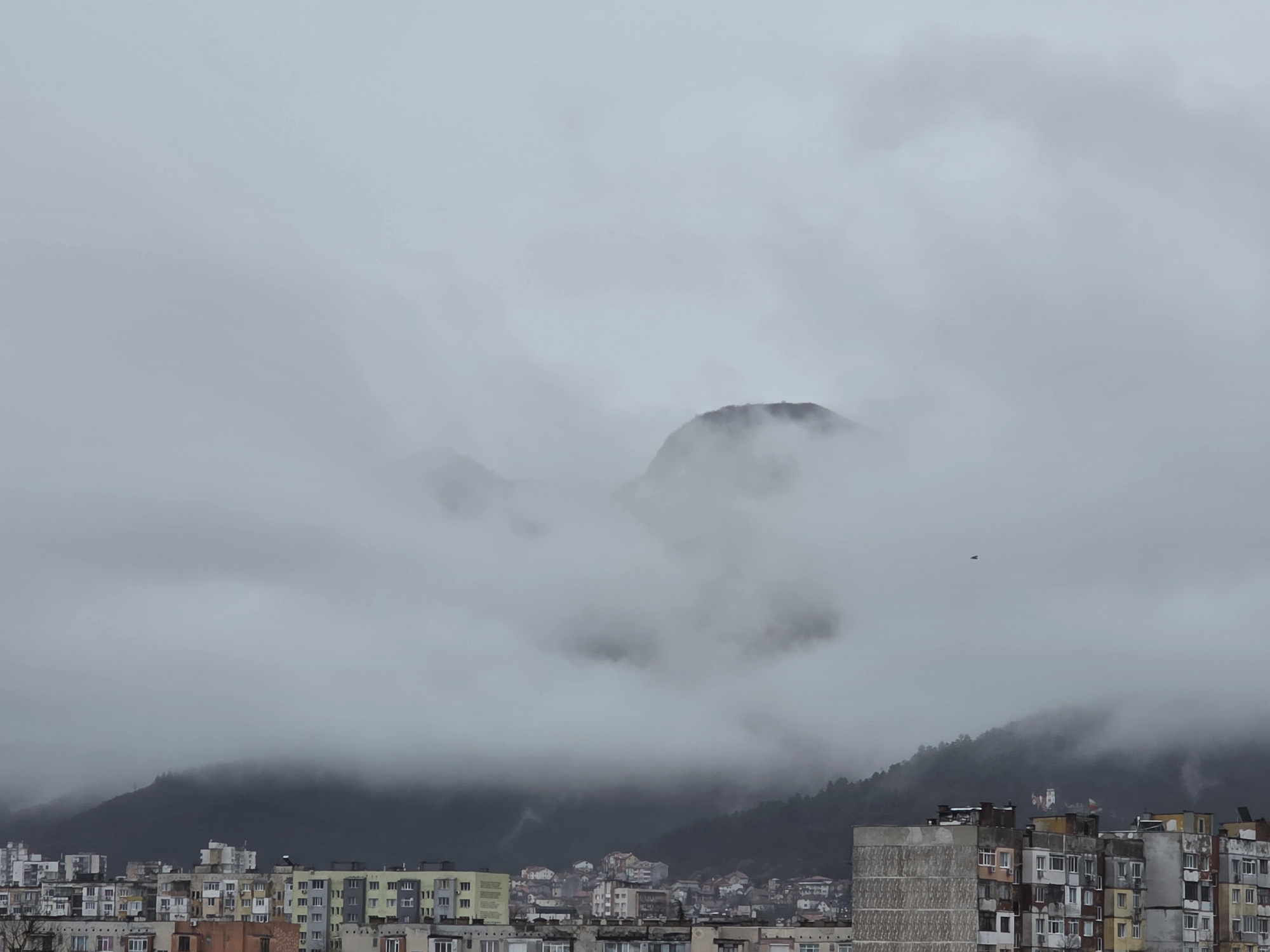 An aerial perspective captures a dense urban residential area of Vratsa, Bulgaria, framed by a mountainous backdrop shrouded in heavy cloud cover. The foreground and midground display numerous multi-story apartment buildings, predominantly constructed with concrete facades varying in shades of grey, yellow, off-white, and muted pastels. These structures feature multiple windows and visible rooftop elements. In the background, the lower slopes of the Vrachanski Balkan mountains rise, covered in dark forestation and partially obscured by a thick layer of fog and low clouds. A prominent, rounded mountain peak is partially visible through a break in the central cloud mass. A small, dark, winged object, consistent with a bird or drone, is observed against the overcast sky in the upper-right quadrant. On a distant mountain slope, a white building with a red roof, possibly a church or memorial, is discernible through a thin cloud veil, accompanied by a flag displaying red, white, and green horizontal stripes. The overall scene depicts a cloudy, possibly cold, daytime environment with no visible human activity.