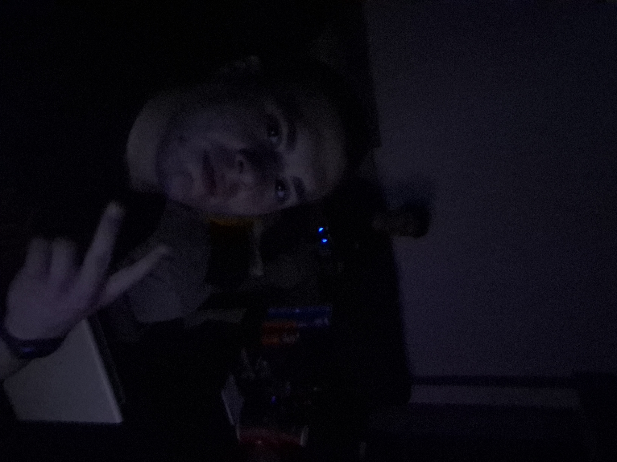 A dimly lit indoor shot shows a person with fair skin and blond hair, oriented at an angle, giving a "peace" sign with their left hand, which has a dark-colored wristband. The room is dark, making it difficult to discern details. Behind the first person, other figures are vaguely visible. There appears to be a table with items on it including a laptop. A shelf or baseboard is visible on the right. Location is not discernible.