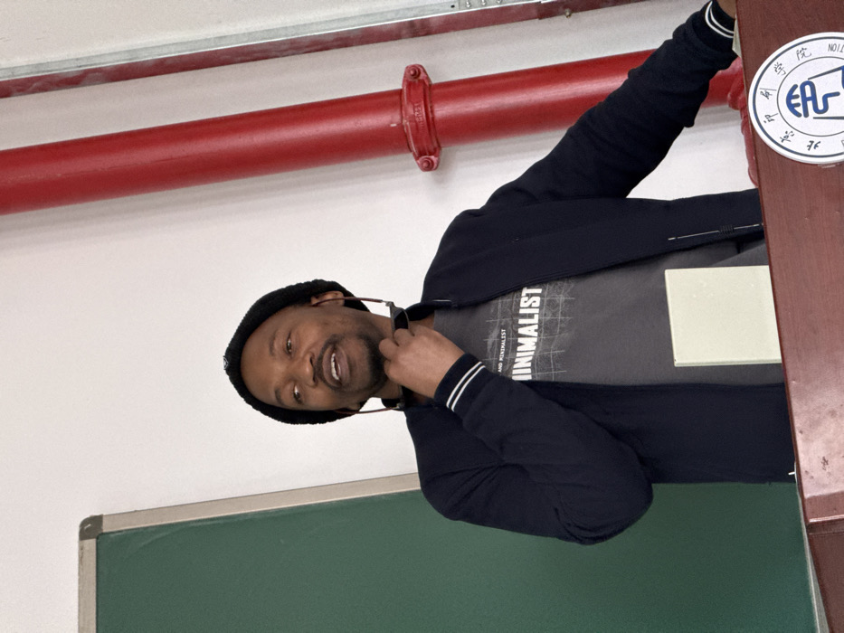 An adult male with dark skin and a beard is depicted from the waist up, standing behind a wooden podium inside a building. He is wearing a black knitted beanie, a dark blue bomber jacket with white striped cuffs, and a grey t-shirt bearing the text "AND MINIMALIST" over a grid pattern. Sunglasses are suspended around his neck. His right hand is raised, with fingers lightly touching his neck. He is looking towards his left, with his mouth slightly open. On the wooden podium in front of him rests a small, light-colored rectangular object. A circular white sticker with blue Chinese characters and a logo, identifiable as the emblem for Beijing Institute of Graphic Communication (北京印刷学院), is affixed to the right side of the podium. The background consists of a plain white wall. To the subject's left, a portion of a green chalkboard with a white frame is visible. To his right, a large red vertical pipe, likely a component of a fire suppression system, extends upwards, featuring a visible metal coupling. A thinner metal structural element is partially visible further right. The scene takes place within a facility of the Beijing Institute of Graphic Communication, located in Daxing District, Beijing, China.