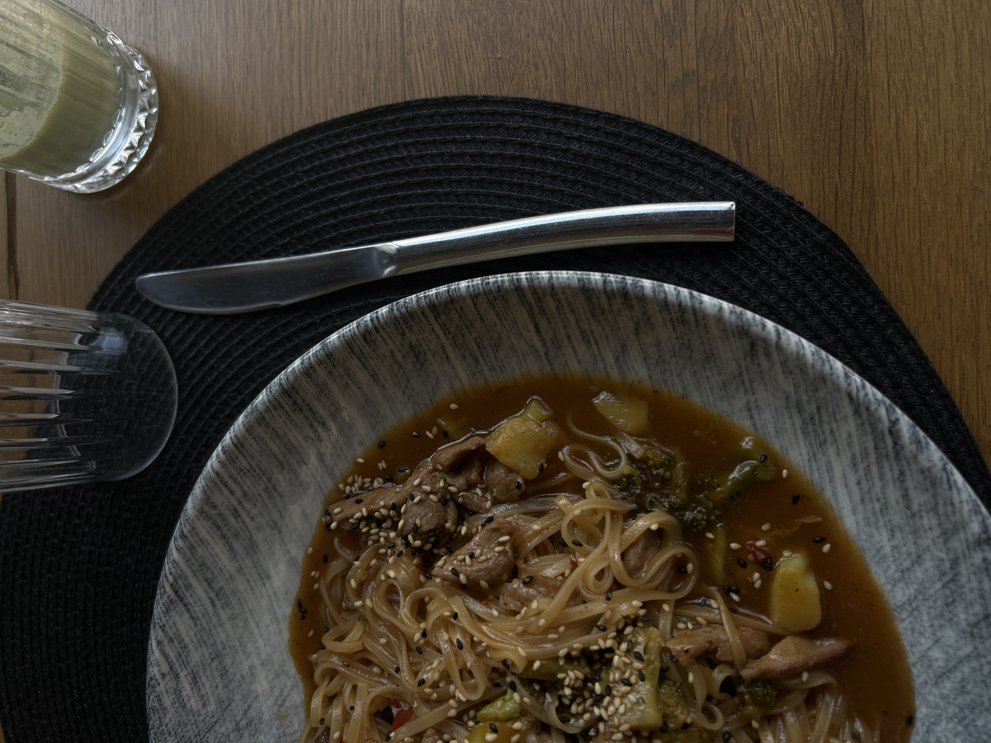The image displays an overhead view of a dining arrangement on a light brown wooden table with visible grain, located in Sofia, Bulgaria. A prominent grey and white patterned ceramic bowl occupies the left side of the frame, filled with an Asian-style noodle dish. The dish comprises translucent noodles, strips of meat, broccoli florets, and yellow vegetable pieces, all suspended in a brown, viscous sauce and garnished with white and black sesame seeds. To the right of the bowl, a silver-toned metal knife rests, partially overlapping a circular black woven placemat. Above the bowl, a clear, empty fluted glass is visible. Further to the upper right, a second fluted glass contains an opaque, light green liquid. No individuals are depicted.