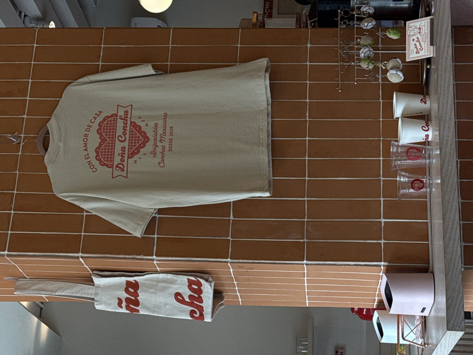 The image depicts an interior scene at a Doña Concha establishment, likely a bakery or café, in San Pedro Garza García, Mexico. A central architectural column, clad in vertical terracotta-colored tiles with white grout, features merchandise displays. A beige short-sleeve t-shirt with a red graphic design is hung on a wooden hanger from a hook. The graphic includes a heart motif, "Doña Concha" on a banner, "MTY MEX", "Inigualables Conchas Mexicanas", and "DESDE 2020", with "CON EL AMOR DE CASA" above. To the left, a light-colored canvas tote bag, partially displaying "ña cha" (part of "Doña Concha") in red text, hangs folded from another hook. On a light-colored countertop extending from the column, various items are arranged. From left to right: a small white triangular container, a pink cylindrical object with an open top, two clear plastic cups with a red circular logo, and two white paper cups branded "Doña Concha". Further to the right, a gold-colored metal stand displays multiple keychains, each shaped like a miniature concha, in white/yellow and green variations. A small white display card with red text and a concha illustration, also branded "Doña Concha", is positioned next to the keychains. The background shows muted walls and indistinct commercial equipment. No people are present.