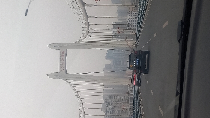 A bridge stretches out under a hazy sky. Two cars are visible on the road, a dark SUV followed by a red car. The bridge's architecture includes vertical white pillars and numerous cables, adding to the structural complexity. Tall buildings form a cityscape in the background, partially obscured by the fog. The view is captured from inside a vehicle, likely a car or bus, as part of the vehicle's interior is visible on the right.
