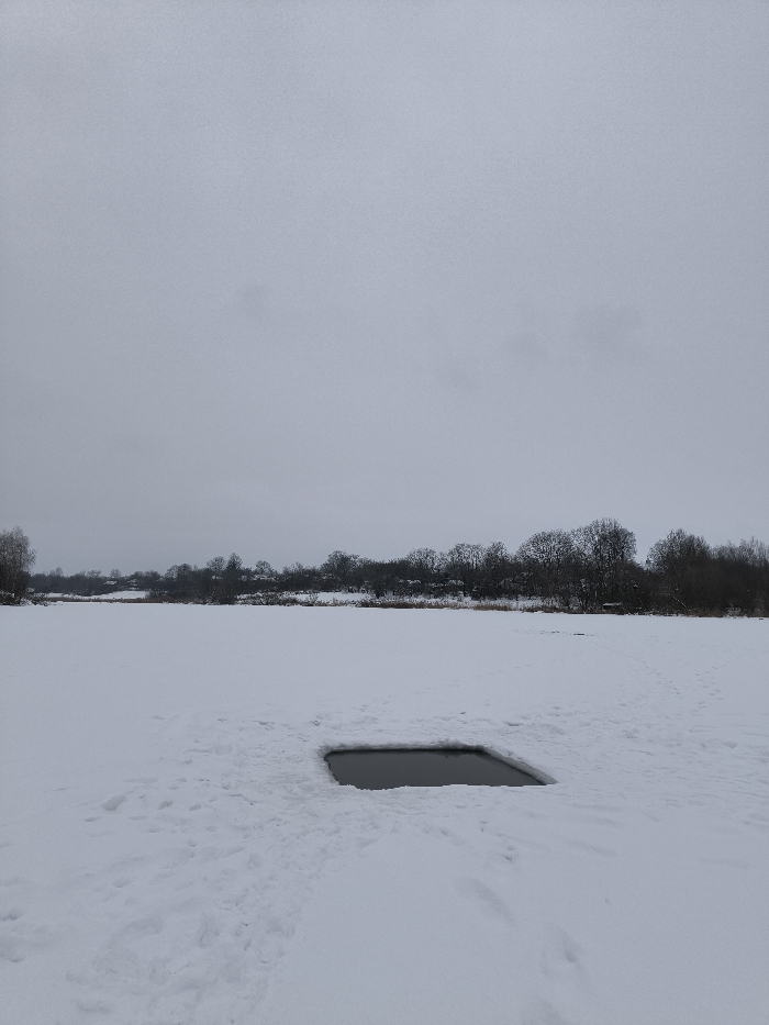 The image depicts a winter landscape in Parkhomivka, Ukraine, under an overcast, light grey sky. A frozen body of water, likely a lake or river, dominates the foreground and midground, entirely covered in a layer of white snow. A rectangular-shaped opening, approximately 1.5 to 2 meters in length and 1 meter in width, is cut into the ice and snow in the midground, revealing dark, open water beneath. Numerous footprints are visible in the snow around this ice hole, suggesting recent human activity, with tracks leading towards and away from the opening. In the background, a dense line of bare deciduous trees and some evergreen foliage forms the distant shoreline, bordering the frozen expanse. No individuals or animals are present in the visible scene.