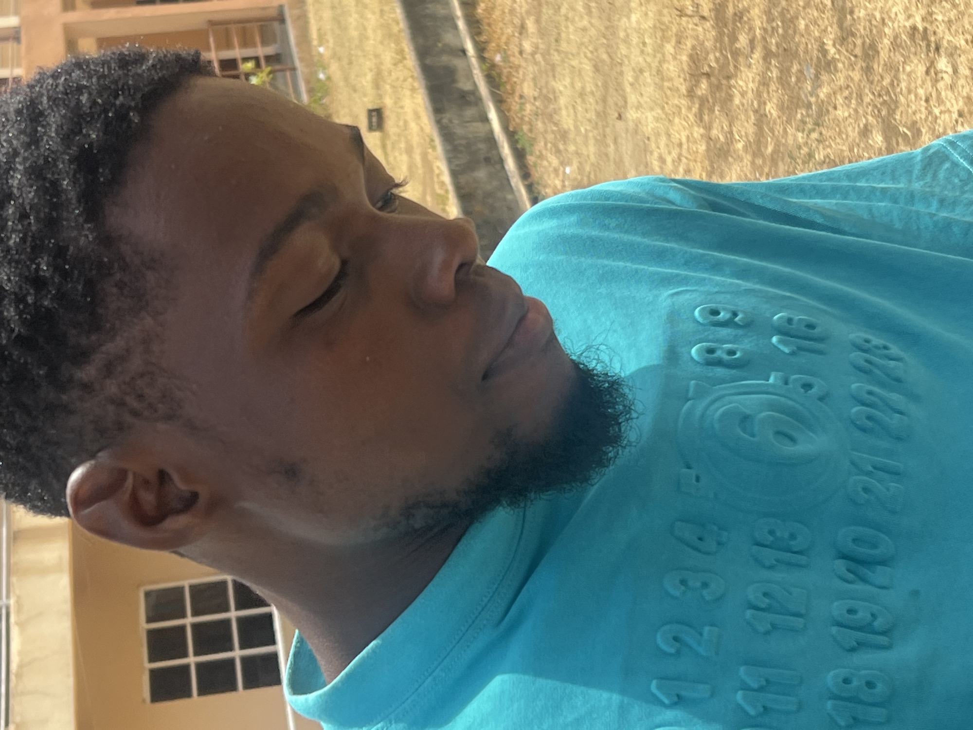 A medium shot of a young man with dark skin, a closely cropped Afro hairstyle, and a trimmed beard and mustache. He is wearing a light blue t-shirt with raised numeric designs. His eyes are closed. The background includes a building with white-framed windows. The location is outdoors with dry grassy areas visible, suggestive of a possible university setting. I do not have sufficient information to confirm the city or other specifics about the location.