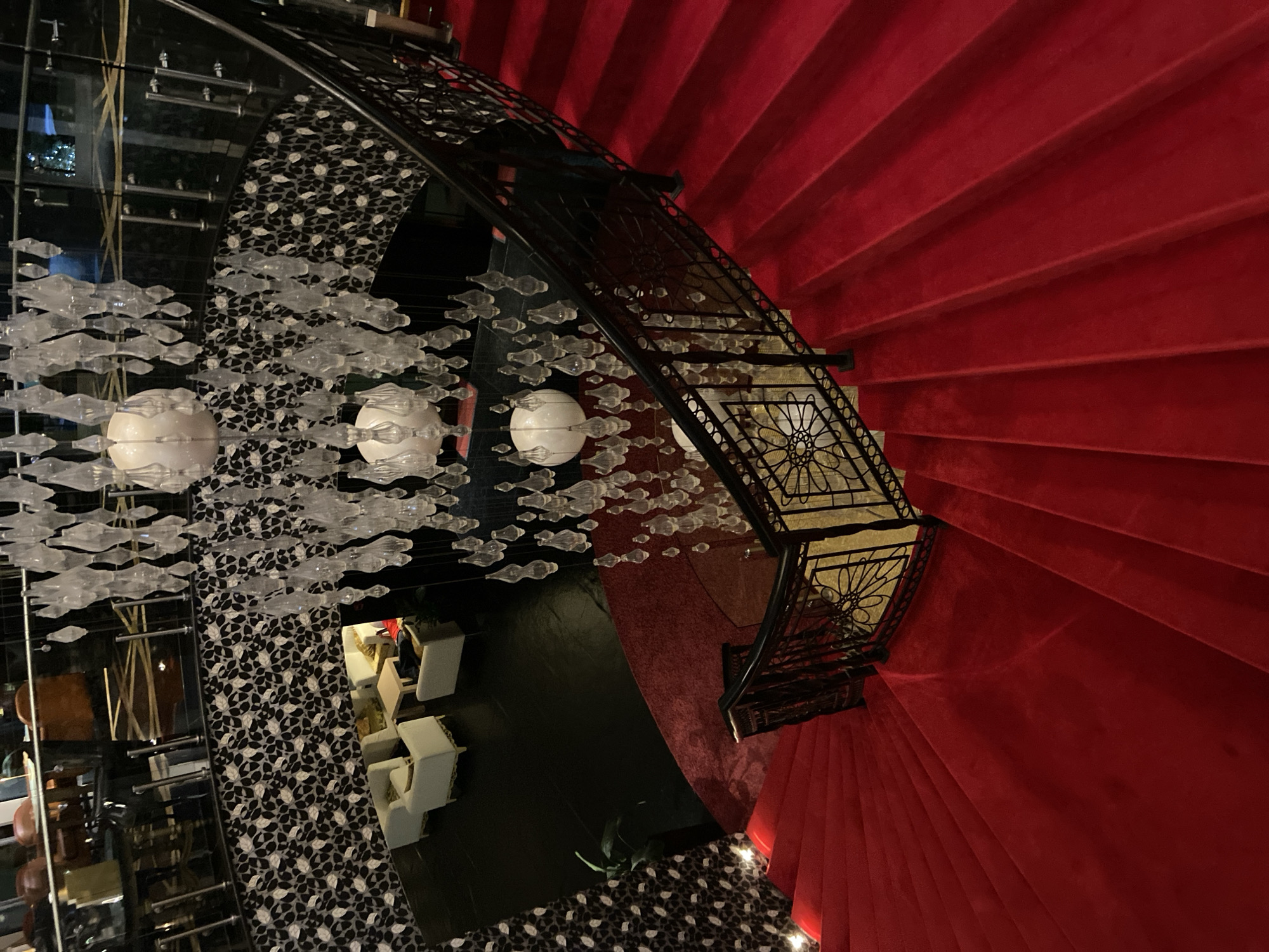 A high-angle shot depicts a grand interior space with a spiral staircase covered in a red carpet. The staircase's ornate black railing runs along the right, curving down. To the left, a decorative chandelier with white spheres and clear, cloud-like elements hangs above a patterned floor. Seating is visible in the lower-left. The image was taken indoors, potentially in a luxurious hotel or residential space in Boreti, Montenegro.