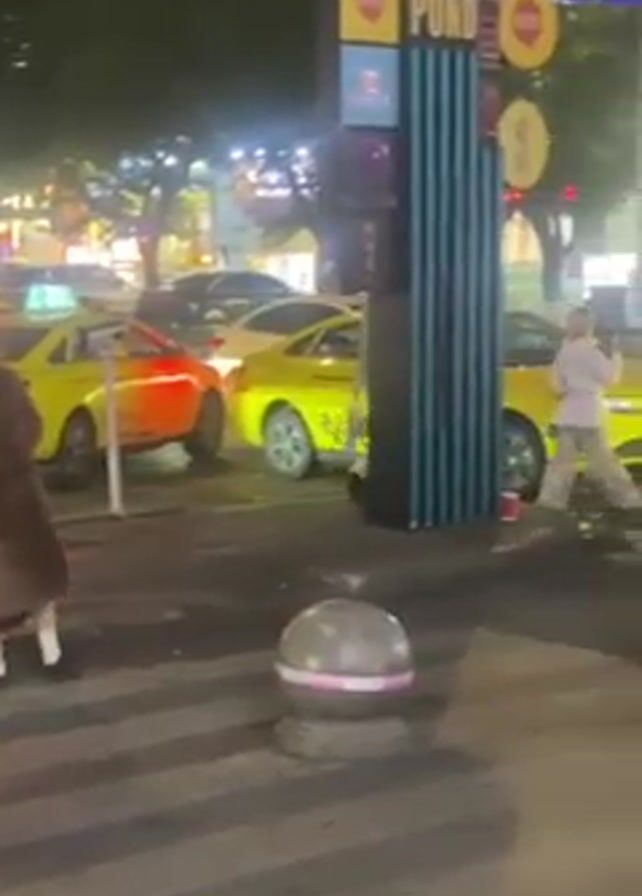 nighttime scene in what appears to be a city street. Several yellow taxis are visible, some lined up along the side of the road. People are walking on the crosswalk and standing near the taxis. The scene is illuminated by streetlights and the headlights of the vehicles. There is a sign on a pole that reads "CARP POND." The overall ambiance suggests a busy urban environment at night.