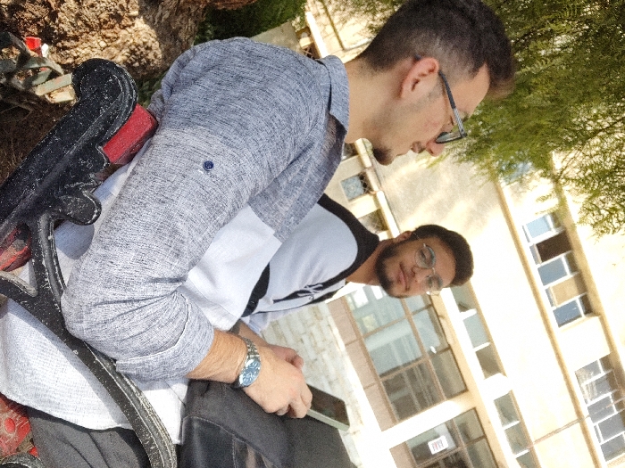 - "Two young adult males are seated on a weathered black metal and red slat park bench outdoors in Ash-Shaghour Municipality, Syria, under bright natural sunlight" by FM-uC8RX2, licensed under CC BY 4.0