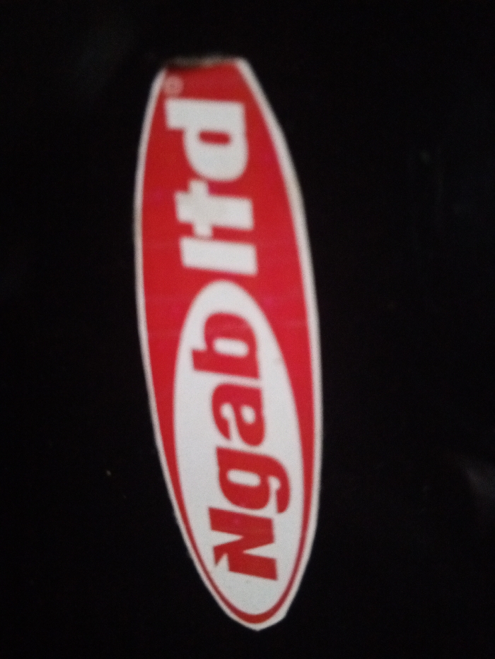 A red oval sticker with white text is affixed to a dark, likely black, background. The sticker, oriented vertically and rotated slightly clockwise, features the word "Ngab" in bold white lowercase letters, followed by "ltd" in smaller white lowercase letters. A small registered trademark symbol (®) is faintly visible near the upper right of the "d". The sticker has a thin white border and shows slight wear at its top edge. No other subjects, people, objects, actions, or interactions are present. The environment is indistinct beyond the dark background. The specific location within Unknown, Indonesia, cannot be determined from the image.