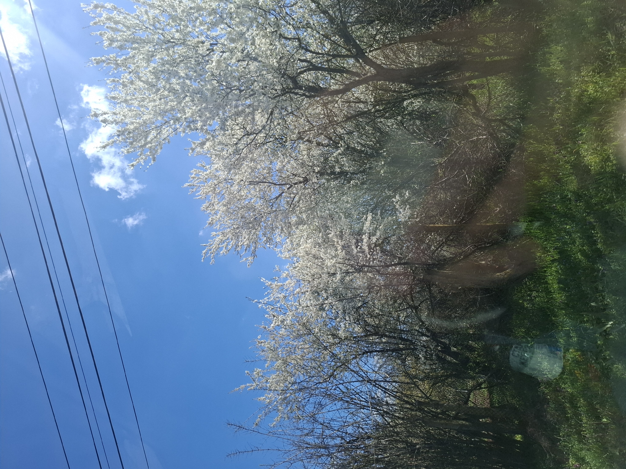 view of trees with white blossoms against a bright blue sky with a few wispy clouds. Power lines are visible against the sky in the lower left. The foreground includes green grass and some indistinct objects. The image appears to be taken looking up through a window, as there are some reflections visible on the lower right. The location is stated to be Smirnenski, Bulgaria, but this is not possible to independently confirm from the visual information in the image.