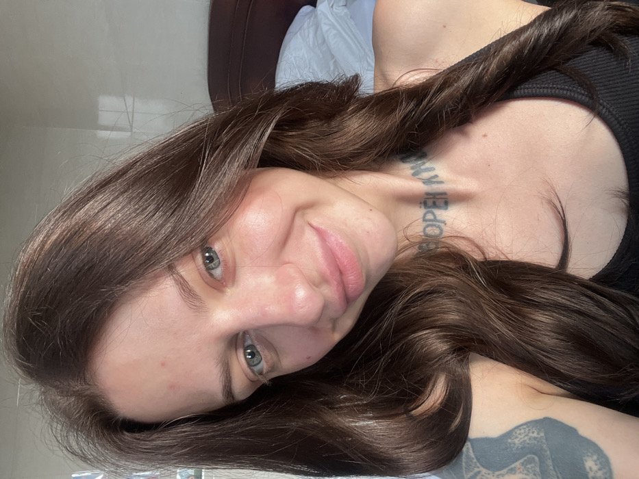 A close-up, chest-up image captures a female individual in an indoor setting in Tibubeneng, Indonesia. The subject has long, wavy, dark brown hair parted on the left, light blue/green eyes, and fair skin with minor blemishes on her forehead. She is looking directly at the camera with a gentle smile, her full lips slightly parted. She is wearing a black, ribbed tank top. A tattoo featuring text in a non-Latin script is present on the right side of her neck, and a large, dark-patterned tattoo is partially visible on her left shoulder and upper arm. The background, out of focus, shows a dark brown wooden headboard and white bedding on the right side, against a light-colored wall illuminated by natural light from the right.