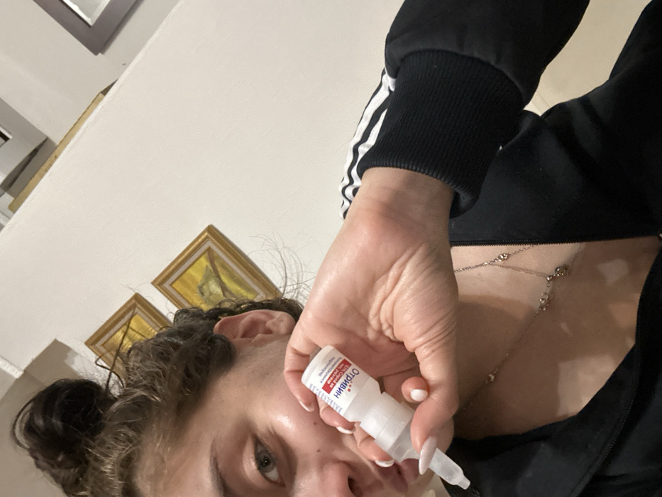 The image displays a female individual captured from the chest up, situated indoors within the city of Plovdiv, Bulgaria. She is holding a white nasal spray bottle, labeled with Cyrillic text including "ОТРИВИН" (OTRIVIN), in her right hand, positioned near her face. Her light-colored eyes are directed towards the camera, and her dark hair is pulled into a bun. She wears a dark, possibly black, athletic jacket with distinctive white stripes on the sleeve and a silver-toned necklace around her neck. Her fingernails are manicured with a light-colored polish. The background consists of a plain white wall, upon which two vertically aligned, gold-framed pictures containing indistinct yellow-toned artwork are mounted.