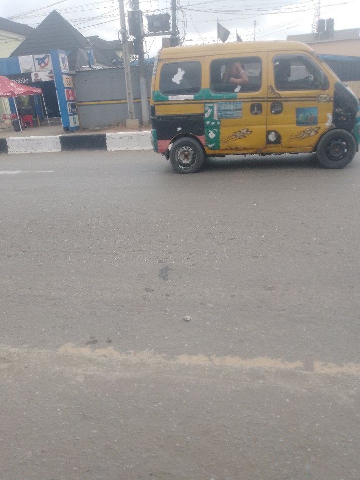 An urban street scene in Lagos, Nigeria, is depicted under an overcast sky. A weathered yellow and black commercial minivan, identifiable as a local public transport vehicle, occupies the mid-ground, positioned on a grey asphalt road. Its sides feature worn, multi-colored decals and artwork, including green, white, and red sections. The front passenger window is open, revealing a person's right arm and shoulder. The vehicle's wheels consist of exposed steel rims. To the left, separated from the road by a black and white striped concrete curb, stands a single-story blue commercial building with a dark gabled roof. The building's facade displays "mobile" text and various telecommunication company logos, including "Glo." A red open-sided tent, also bearing "mobile" text, extends from the building, with red chairs visible beneath it. Behind this, a grey wall with a yellow stripe runs horizontally. In the background, a dark utility pole with a mounted electrical box supports numerous overhead wires. Two dark flags are visible on a distant rooftop to the right of the pole. The asphalt road surface in the foreground shows minor imperfections and scattered small debris. No overt actions or interactions beyond the visible occupant in the vehicle are discernible.
