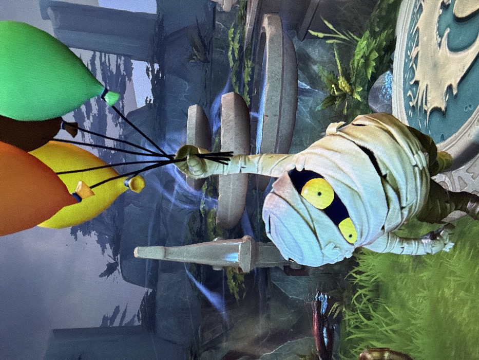 A cartoon mummy character is suspended in mid-air, holding a bunch of colorful balloons (green, brown, orange, yellow) by their strings