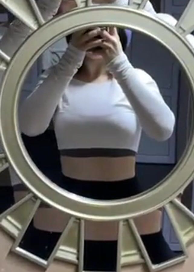 A woman with headphones is taking a photo of herself in a mirror. She is wearing a white long-sleeved crop top and black leggings. The mirror is round with a decorative gold frame. The background is a room with a closed door.