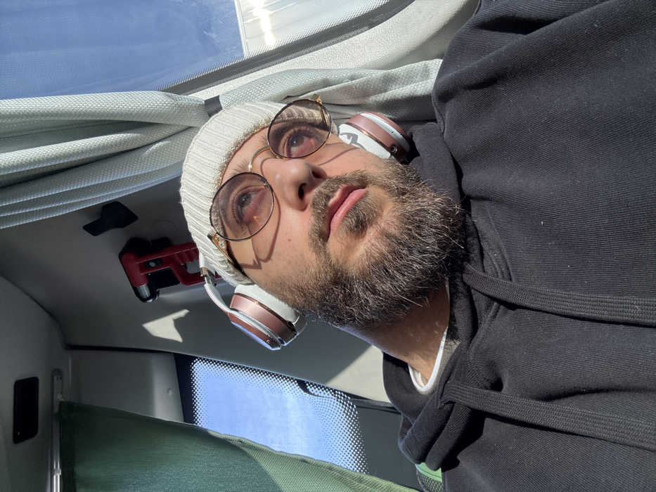 The image displays an adult male inside a vehicle, located in Caen, France, under bright daylight conditions. He is seen from a close, upward-angled perspective, wearing a white knitted beanie, round gold-rimmed glasses with reddish-tinted lenses, and white and rose gold over-ear headphones. The individual has a dark beard and mustache and is dressed in a black hooded sweatshirt worn over a white collar. His head is tilted slightly upwards and to the right, with his eyes looking in that direction and his mouth slightly ajar. Direct sunlight illuminates his face and the right side of his body, casting distinct shadows. The vehicle's interior features a light gray ceiling and pillar. A dark green curtain hangs on the left side of the frame, and a light gray pleated curtain is present on the right, partially obscuring a window revealing a clear blue sky. A red and black handheld object, possibly a portable lamp or tool, is mounted on the overhead panel, adjacent to a smaller black object.