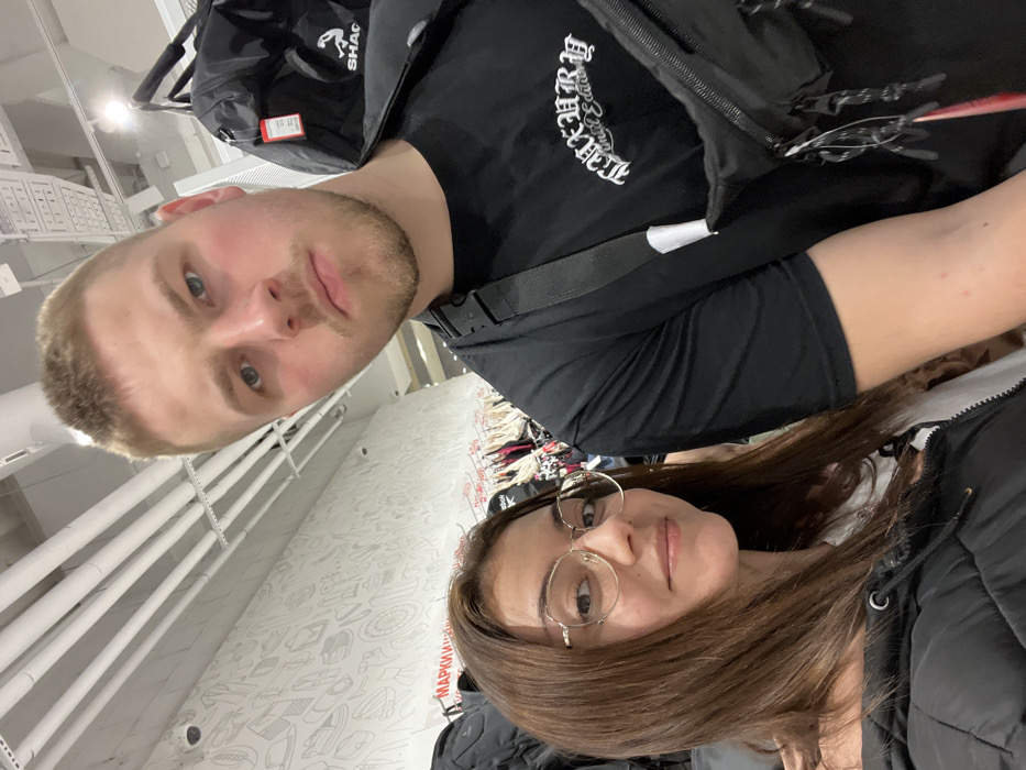 The image captures a selfie-style shot of two individuals, a female and a male, inside a sports retail store in Sofia, Bulgaria