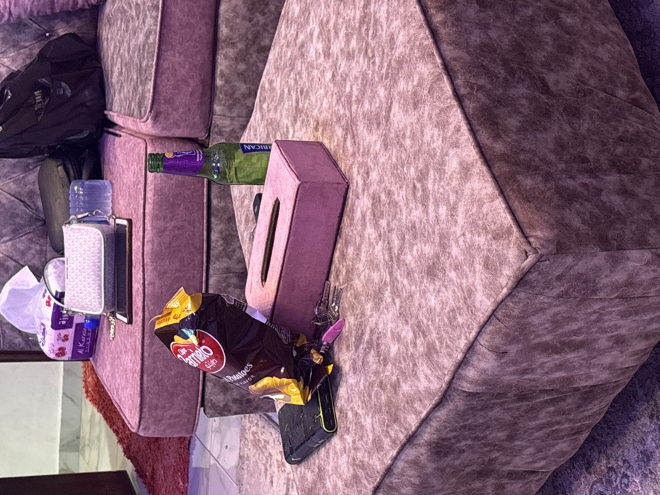 A cluttered couch features a black backpack, a water bottle, and a purse. A green glass bottle rests near a pink tissue box, accompanied by keys. A bag of potato chips and a cell phone are positioned at the couch's edge. The couch, upholstered in textured fabric, displays varying shades of brown and purple.
