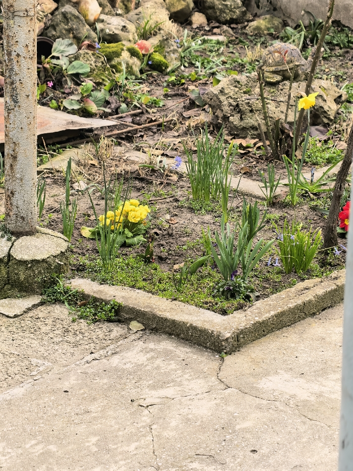 This image captures a ground-level view of a garden area in Topoli, Bulgaria. The foreground features a cracked concrete path that extends along the bottom and left edges of the frame. A raised garden bed, roughly rectangular, is bordered by concrete blocks. Within this bed, dark soil supports various spring flora: a dense cluster of yellow primroses is positioned in the lower-left, numerous green shoots of emerging bulbs are scattered throughout, and a single yellow daffodil is in bloom towards the right, situated behind other green foliage. Small clusters of blue flowers are also visible in different sections of the bed. A rusty, flaking metal pole rises vertically from a concrete base in the lower-left corner. Beyond the garden bed, the background reveals an unkempt area of loose soil, moss-covered rocks, sparse vegetation, and debris. A decorative turtle figurine rests atop a rock in this background section, slightly to the right of center. No individuals or dynamic actions are depicted.