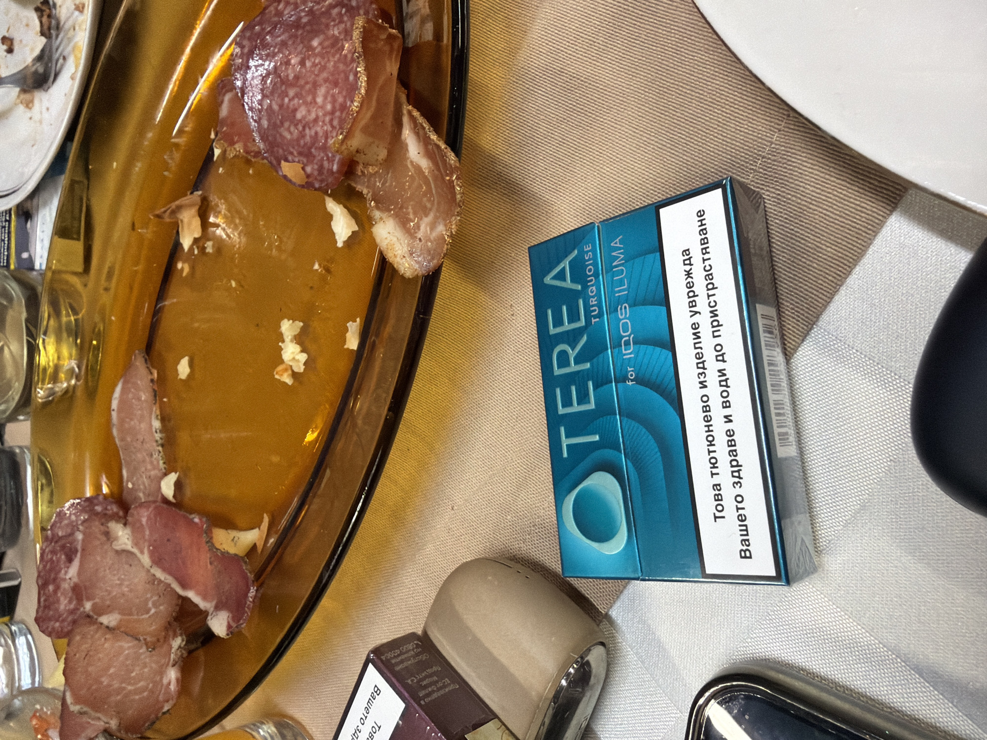 The image presents a tabletop scene, possibly in a restaurant or a home setting. A transparent, amber-colored platter occupies the left side, containing what appears to be sliced meat, possibly salami and prosciutto, along with some scraps or remnants of food. The center of the image features a box of "TEREA Turquoise for IQOS ILUMA" tobacco sticks, with text in Bulgarian warning about the health risks of tobacco use. Adjacent to the box is a small, beige-colored device, possibly related to the IQOS device. Portions of white plates and possibly other dining utensils are scattered around the scene. Given the text on the TEREA package being in Bulgarian, it is plausible that the location is in Bulgaria. However, there is nothing in the visual information to definitively place the scene in Mizia or any other specific city.