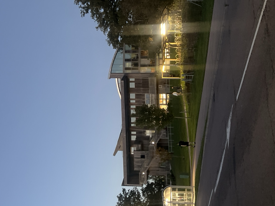 This image depicts an exterior view of the L'Oréal Centre of Excellence building, part of the Essex Business School, located at the University of Essex in Wivenhoe Park, Colchester, United Kingdom. The scene is captured during twilight or early night, evidenced by the dark blue, cloudless sky and activated artificial lighting. The dominant subject is the multi-story L'Oréal Centre of Excellence building in the background, characterized by modern architecture featuring extensive horizontal wooden cladding. It possesses a distinctive roofline with both angled and curved glass sections. Numerous interior lights are active, visible through the building's rectangular windows, and an external wooden staircase is prominent on its left facade. In the mid-ground, a brightly illuminated, covered bicycle rack structure is visible to the right. This structure has a metal frame, a roof, and multiple bicycle stands; a strong overhead light within it creates a noticeable vertical lens flare. Two individuals are positioned near this bicycle rack; one is wearing a light-colored top, and the other is largely obscured by shadow. To the left, a single person, dressed in a dark t-shirt and dark shorts, walks away from the viewer on a paved sidewalk. A modern glass-paneled bus stop shelter is situated further left on the sidewalk. A green utility box is also present on the grass. The foreground consists of an asphalt road with a white painted directional arrow, running parallel to the sidewalk. The intervening areas are landscaped with grass and young trees, demarcated by low fencing.