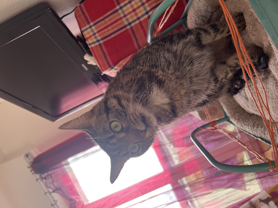 A domestic short-haired tabby cat, exhibiting brown, black, and grey striped fur with a lighter chest, is positioned centrally within a light blue-green framed pet bed lined with beige plush fabric. The cat's prominent green eyes are directed forward, and its mouth is slightly agape. Orange string is wrapped around the bed's frame and lies across the bedding in front of the cat's paws. In the background, a brightly illuminated window with red and sheer patterned curtains is visible on the left. To the right, a black flat-screen television is mounted or placed above a surface covered with a red and plaid fabric, where a small white object is also present. The scene takes place indoors in the city of Strasbourg, France.