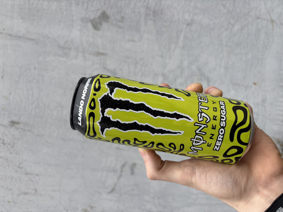 - "A human right hand, fair-skinned, is prominently displayed holding a full Monster Energy Zero Sugar beverage can, Lando Norris edition" by FM-TOlO53, licensed under CC BY 4.0