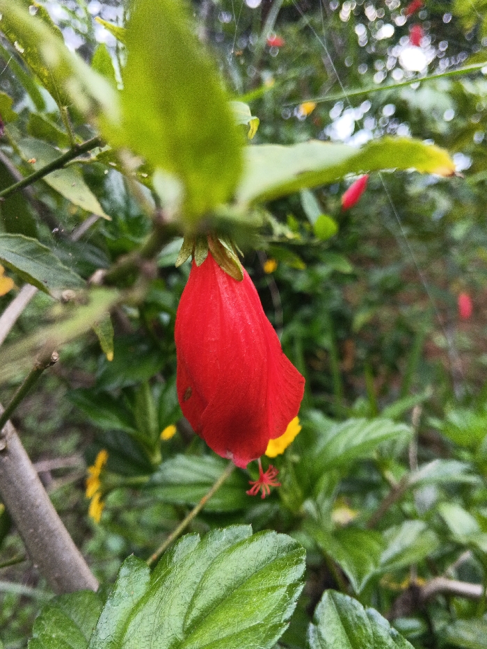 A vibrant red Turk's cap flower hangs prominently, its unique shape reminiscent of a closed tulip. Lush green foliage surrounds the blossom, creating a natural frame. Hints of yellow flowers peek through the dense greenery, adding subtle contrast. Spiderwebs, glistening with moisture, are visible in the background, subtly connecting the plants. A branch extends diagonally into the shot, adding depth to the composition.