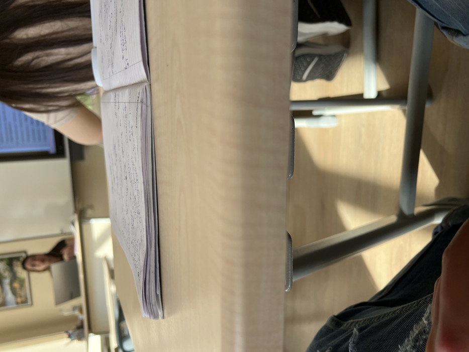 The image depicts an indoor classroom environment in Buzovgrad, Bulgaria. In the immediate foreground, a light-colored wooden desk surface is prominent, upon which an open notebook with handwritten text is displayed. Below this desk, the lower extremities of an individual, clad in ripped blue jeans, are visible on the left, along with a hand. Grey metal desk legs and supports are also visible, casting distinct shadows on the light wooden floor, indicating a direct light source from the left. To the right, beneath an adjacent desk, black and white athletic footwear belonging to another individual is partially visible. In the mid-ground, a person with long, dark brown hair and a light-colored top is seated at a desk, facing away from the viewer. To the left in the background, a second individual is seated at a desk, facing towards the right side of the frame. This person has dark hair, wears a dark top, and has an open silver laptop positioned on their desk. Behind this individual, a light-colored wall features a framed landscape picture. To the right, a large white board or projection screen displays indistinct digital content. The overall lighting is bright, with sunlight creating defined shadows on the wooden floor.