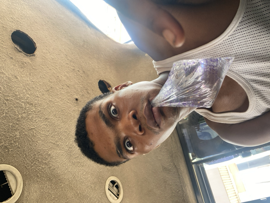 The image captures a close-up, upward-angled view of a young Black male inside a vehicle in Shagamu, Nigeria. The male, facing the camera, displays a wide-eyed, exaggerated expression, with his mouth holding a clear plastic sachet filled with liquid. He wears a white ribbed tank top. The vehicle's interior ceiling, light-colored and textured, fills the upper portion of the frame, showing two circular ventilation outlets—one fully visible and one partially obscured—along with several irregular perforations indicating wear. Bright daylight from an external source is visible through a window on the left side, revealing a faint building structure in the background. A dark-skinned hand extends into the lower right foreground.