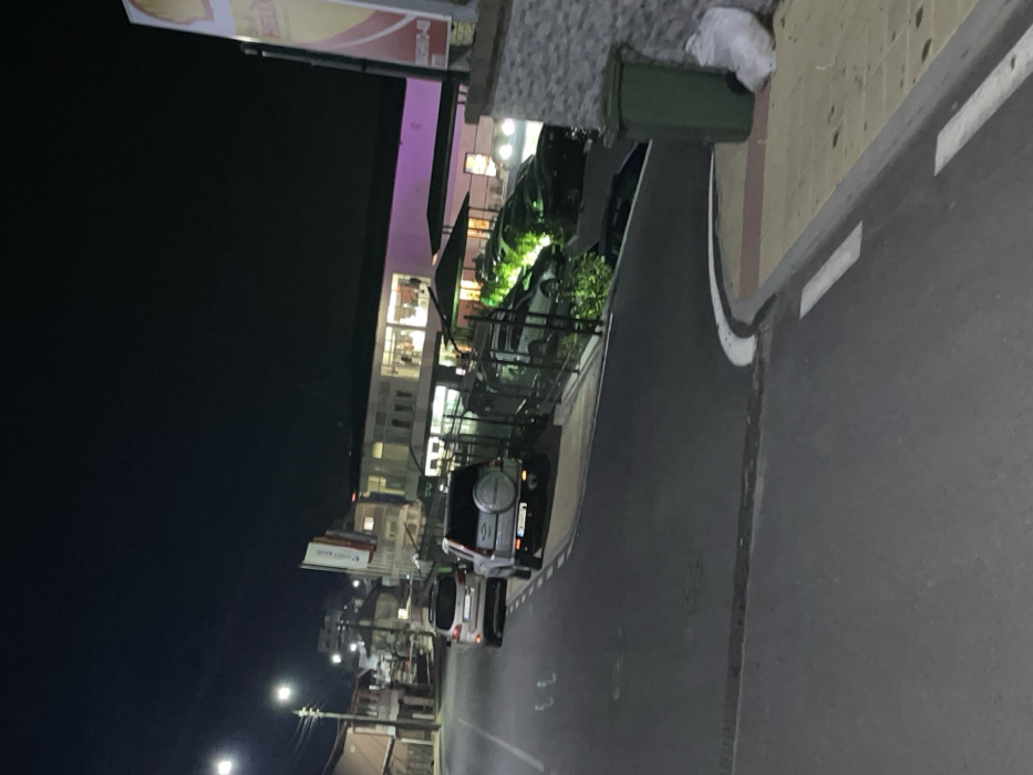 This image depicts a nighttime street scene in Zlatograd, Bulgaria. The perspective is from a slight elevation, looking down a paved road. In the foreground, the asphalt road features white dashed lines delineating a curb that leads to a paved sidewalk on the right. A dark green, wheeled trash bin rests against a light gray, stone-clad wall on the right sidewalk, with a white refuse bag positioned beside it. In the midground, two vehicles are parked on the left side of the road, facing away from the viewer: a silver first-generation Honda CR-V with a rear-mounted spare tire, followed by a lighter-colored SUV. To the right, a black metal fence or railing separates the road from an adjacent commercial property. This property features a parking area where multiple dark-colored vehicles are visible under green accent lighting originating from landscape elements. Two covered structures with awnings are also present. The background reveals several buildings. On the far right, a large commercial building is illuminated internally and features a prominent "Shell Helix" sign. Portions of this building display purple ambient lighting. Further down the street on the left, additional buildings are visible, including a multi-story structure with a partially obscured "POST BANK" sign. The sky is dark, indicative of nighttime, and the scene is illuminated by multiple streetlights, building lights, and the aforementioned green accent lighting. No individuals are visible in the frame.