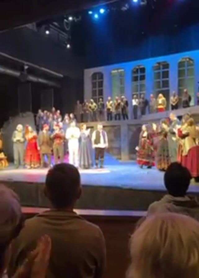Certainly! Here's a detailed description of the video: The video shows the end of a performance on a theater stage. A large group of cast members dressed in period costumes are lined up and taking a bow. They are facing the audience, which is visible from the back and sides of the auditorium. The audience is applauding. The stage is set with what appears to be a backdrop of a building facade, including windows and some raised platforms. The lighting is bright, with a mix of blue and white spotlights. The cast members are of mixed ages and ethnicities, and their costumes vary considerably, including dresses, vests, hats, and other period garments. Some are waving or smiling at the audience. The general atmosphere is celebratory and enthusiastic.