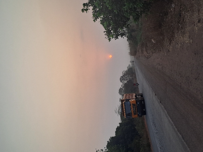 A muted sunset casts an orange glow over a rural road. A large, orange dump truck travels along the asphalt, heading towards the setting sun. Trees line one side of the road. Overgrown grass and dirt make up the other side. A small vehicle is barely visible further down the road. The sky is hazy and overcast.